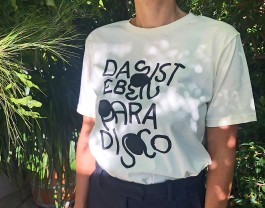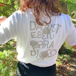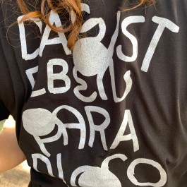 Silver print on back OR on front. EarthPositive climate-friendly, vegan and organic T-shirt. Unisex. Artwork by Simon Meier. Screenprint by Pintura Peligrosa